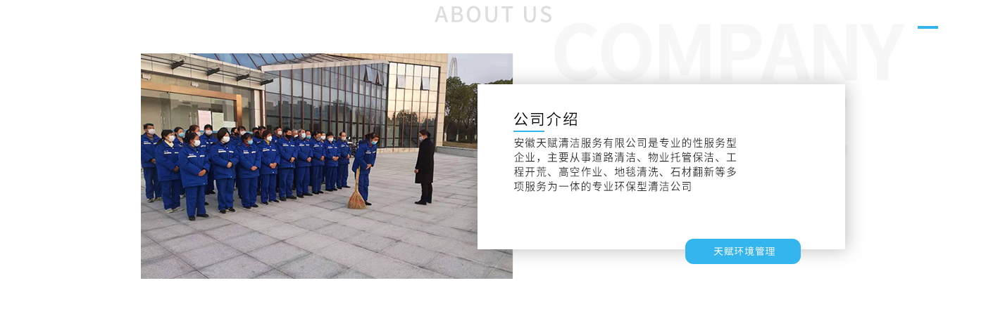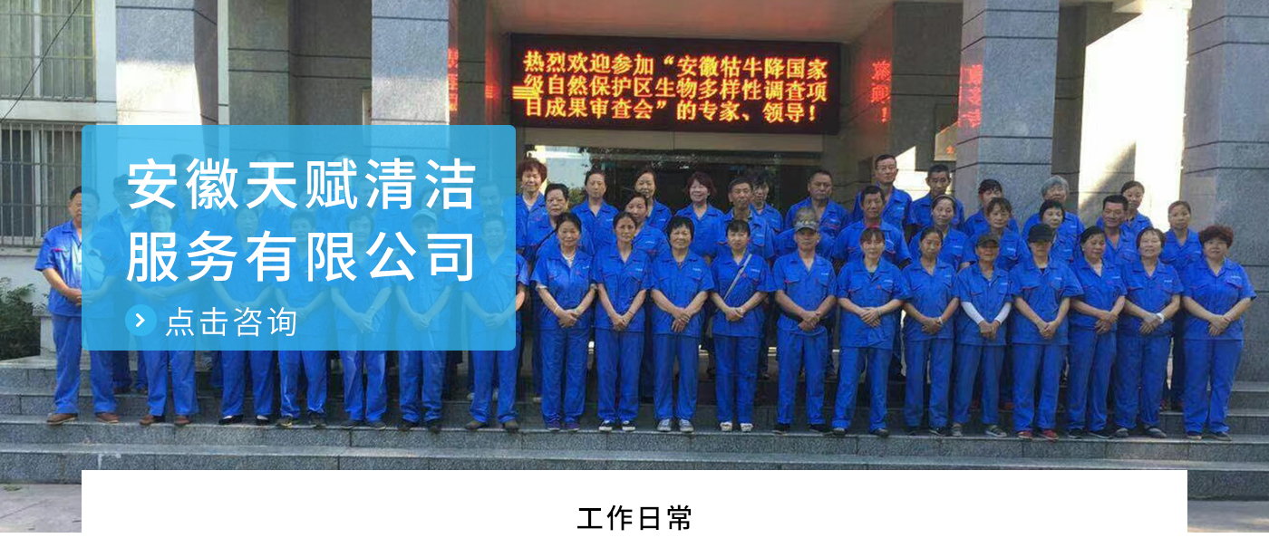 安徽天賦清潔服務(wù)有限公司是的服務(wù)型企業(yè),主要從事道路清潔、物業(yè)托管保潔、工程開荒、高空作業(yè)、地毯清洗、石材翻新等多項(xiàng)服務(wù)為一體的環(huán)保型清潔公司。公司管理機(jī)制完善,清潔作業(yè)經(jīng)驗(yàn)豐富,擁有技術(shù)力量,嚴(yán)格實(shí)行崗前培訓(xùn)—崗中督查—上崗在培訓(xùn)的員工管理措施,憑著優(yōu)良的清潔質(zhì)量和嚴(yán)格的督查管理,為眾多企事業(yè)單位、醫(yī)院、酒店、廠區(qū)商場、物業(yè)、道路、學(xué)校、公園等提供后勤清潔服務(wù)。在業(yè)內(nèi)擁有良好的口碑。工作人員,服務(wù)態(tài)度優(yōu),竭力為客戶提供好的保潔服務(wù)。安徽天賦清潔服務(wù)有限公司:致力于長期合作關(guān)系,提高服務(wù)質(zhì)量,提供高標(biāo)準(zhǔn)的清潔服務(wù)。公司的經(jīng)營理念:為營造一個(gè)更清潔、亮麗的生活和工作環(huán)境而努力!“誠信”是公司成功保證。“客戶至上,信譽(yù)為首”是公司宗旨。高標(biāo)準(zhǔn)提供服務(wù),維護(hù)客戶利益、形象,是我始終不渝的目標(biāo)。